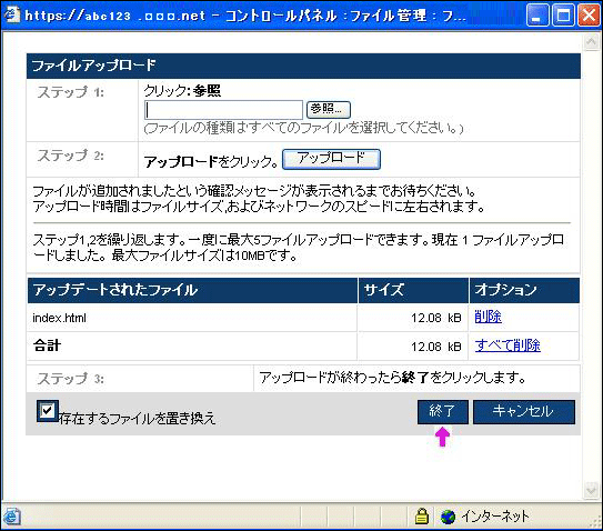 7.終了をクリックするとファイルがアップロードされます。