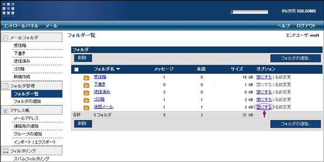 迷惑メールフォルダは、システムフォルダの1つで、SpamAssassinが迷惑メールと判定したメールを振り分けます。