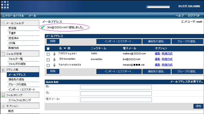 4.5 上記 4.4 の画面中のをクリックすると、コントロールパネル上部に追加完了のメッセージが表示されます。