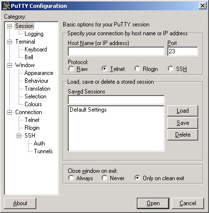 PuTTY は、SSH、Telnet、Rlogin 対応のフリーの Windows 32-bit クライアントです。Session 設定パネルで基本的なオプションが設定できます。また設定は次回のアクセスのために保存可能です。以下の事例を参照下さい。